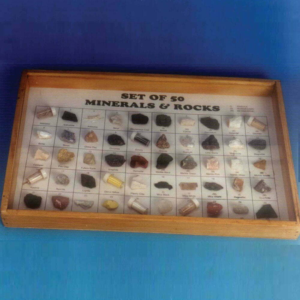 A collection of different rocks and minerals, in wooden box, with containing 50 specimens. Each specimen is labeled.