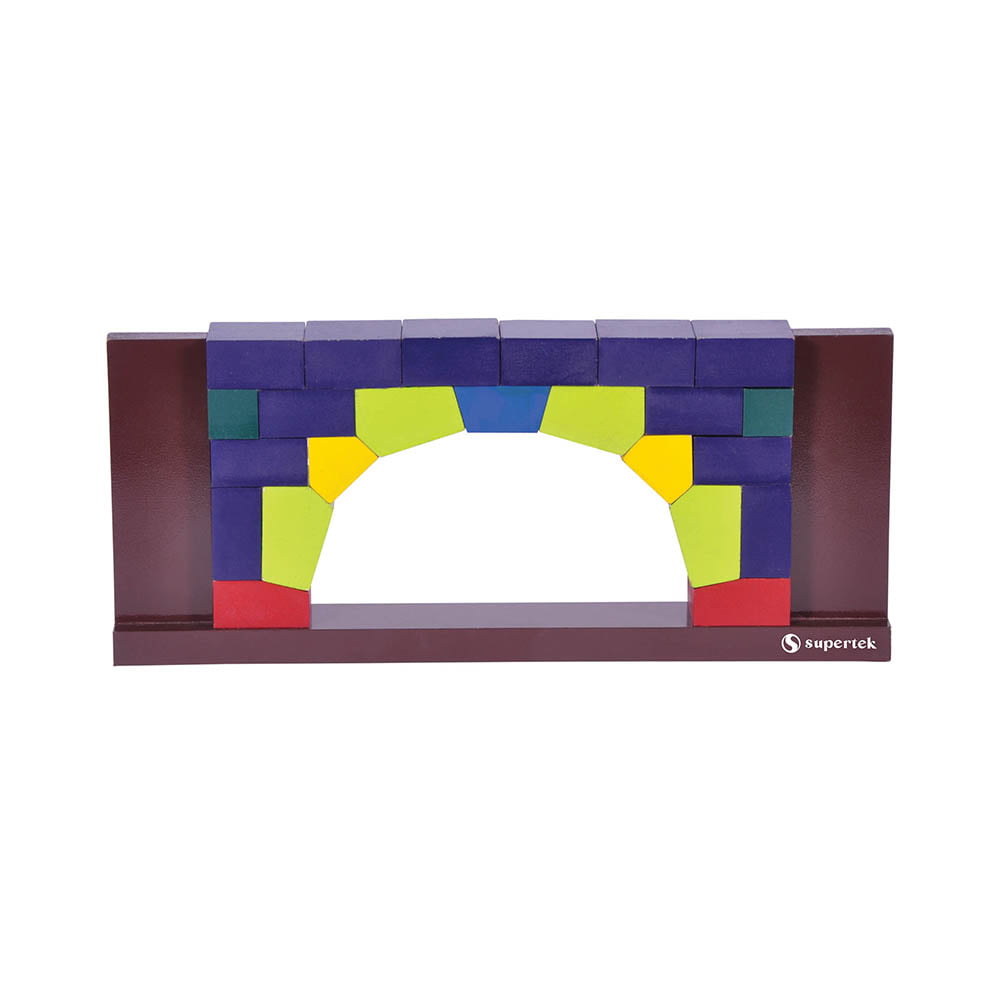 Demonstrates the typical concept behind the architecture of Roman arch structures, which are famous for their strength in compressive loading. Comprise of a pre-assembled 3-part buttress and a set of 23 wooden blocks. A fully assembled arch can easily support the weight of a child.