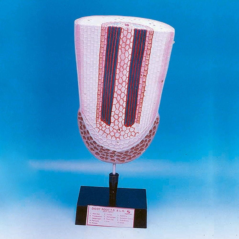This model illustrates the tissue arrangement in plant stems, featuring transverse, longitudinal, radial, and tangential cuts for clear structural details. Monocot roots highlight distinct regions including Epiblema, Cortex, Endodermis, Pericycle, Vascular bundles, and Pith. Mounted on a stand with a key card for reference.
