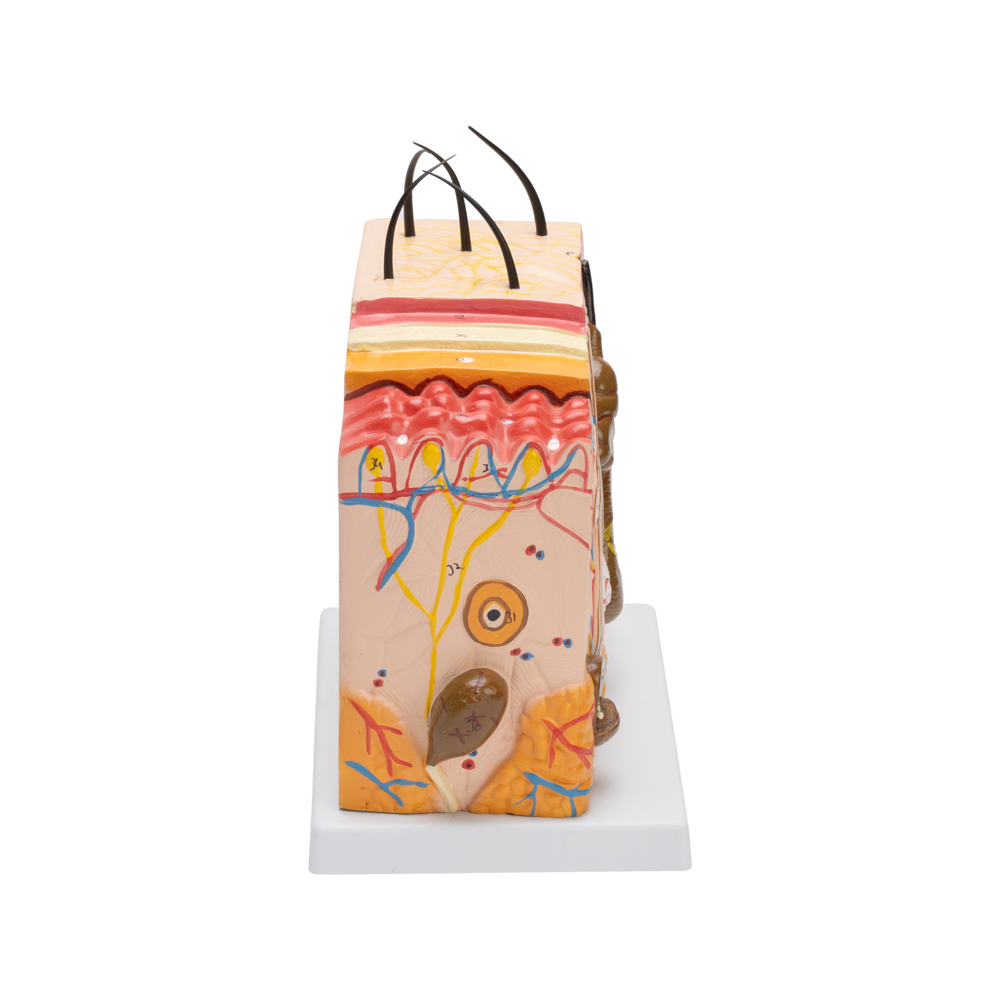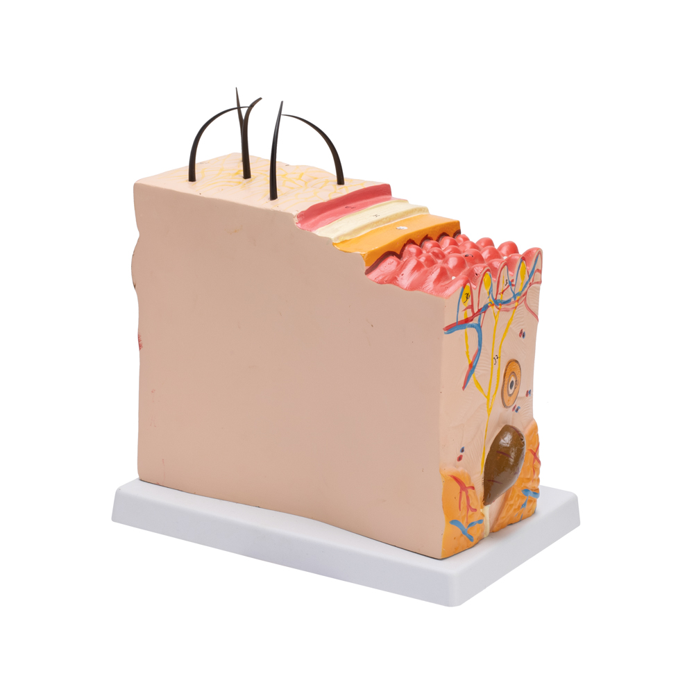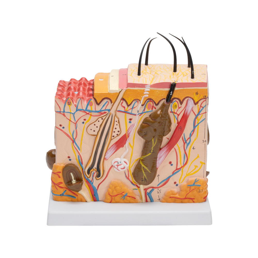 Model shows 3-D section of human skin. Enlarged section show three layers of the hair covered skin of the head, showing hair follicles, with sebaceous sweat glands, receptors, nerves, and vessels.