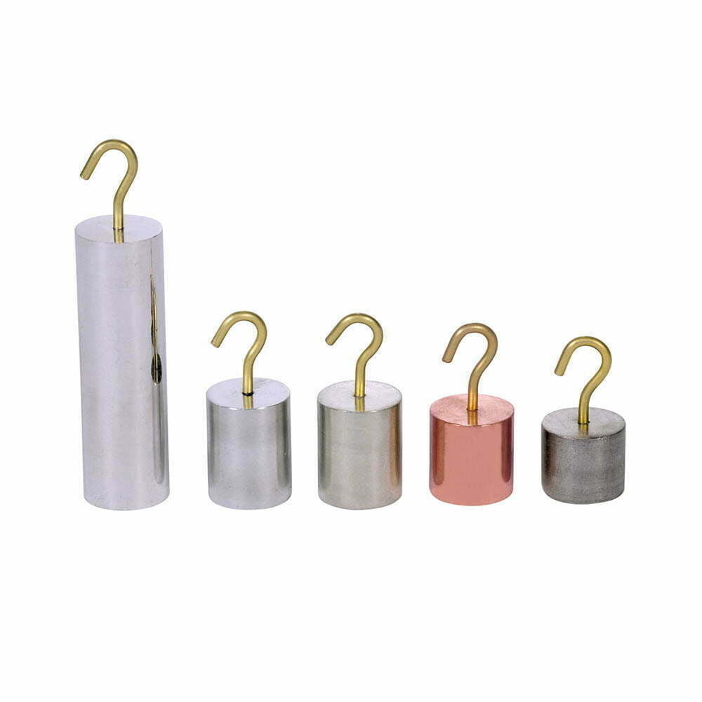 Consists of five 1/2″ diameter hooked cylinders machined to equal mass. Metal identifications stamped on one end. Includes Aluminum, Copper, Stainless Steel, Tin and Zinc.