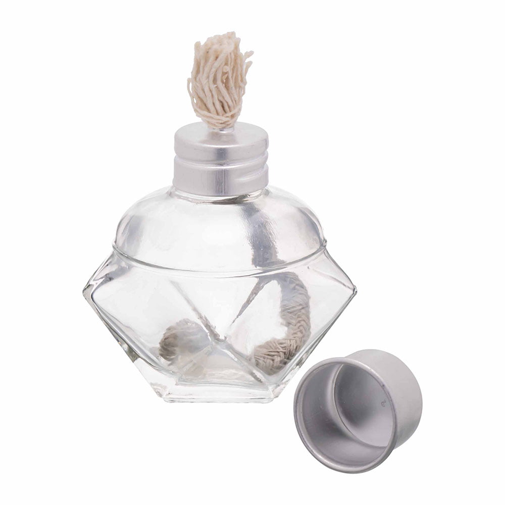 Polyhedral, heavy duty, complete with cap and one wick. Capacity 100 ml approx.