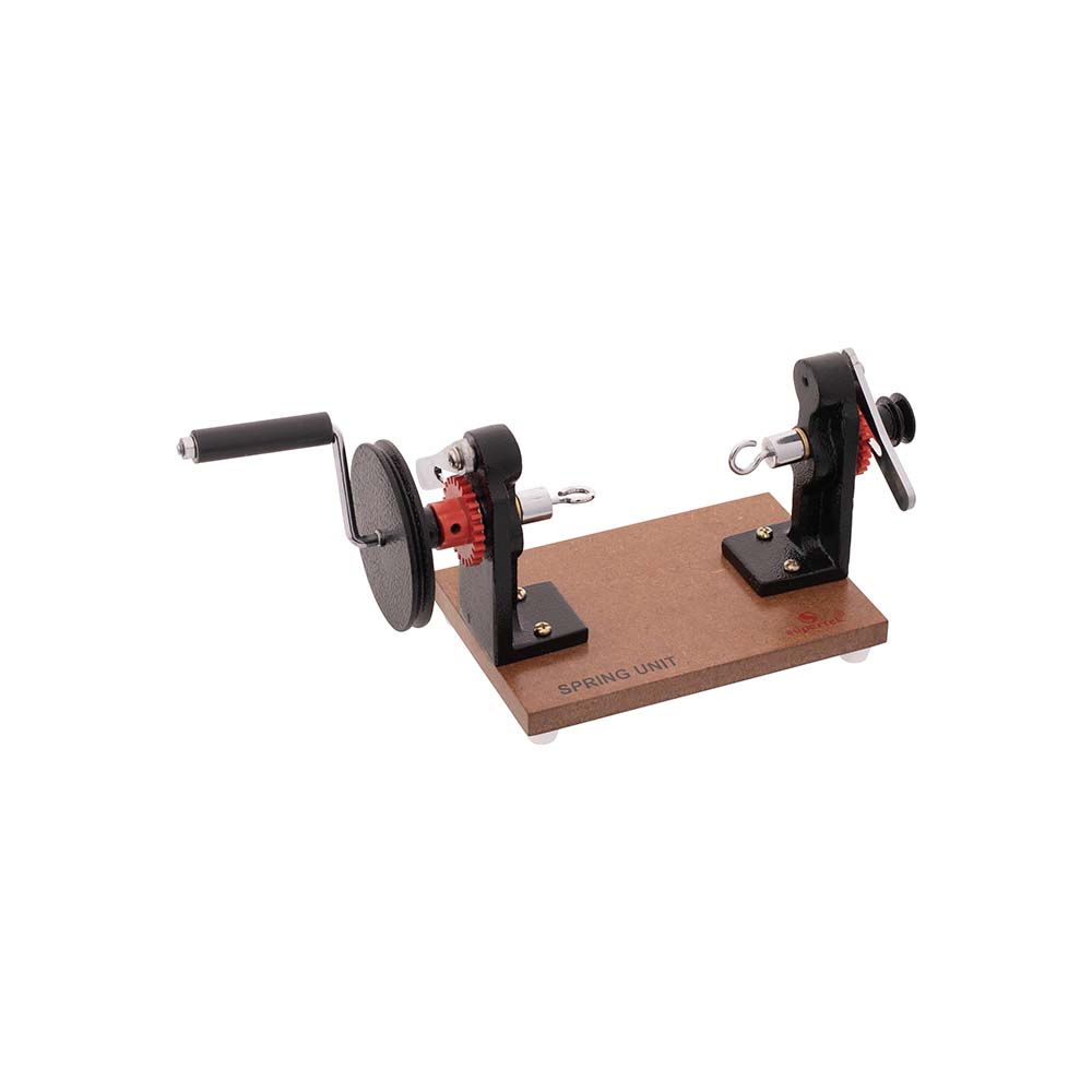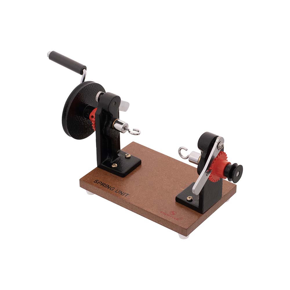 For showing conversion of potential energy stored in twisted rubber to kinetic/electrical energy. Elastic bands are looped and stretched between pulley and support. A crank handle and pulley combined with ratchet stop allows the rubber to be wound up and released to drive a dynamo, supplied without dynamo.