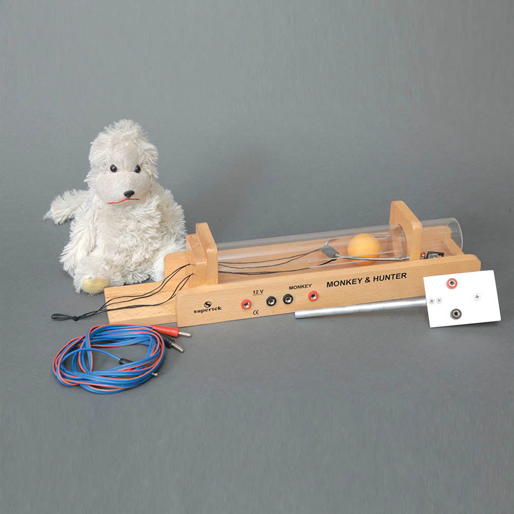This apparatus illustrates the effect of gravity on the projectile motion. An elastic-powered gun is supported from a battery-operated small electromagnet. It fires ping-pong bullet balls at a model monkey. When the projectile is fired, the electromagnetic circuit breaks. The trajectory is easily visible. Both monkey and bullet fall at the same rate and the bullet always hits the monkey regardless of how far away the monkey is. This proves that the horizontal and vertical motions are independent of each other. This unit includes a table clamp mounting plate and it may also be used as a trajectory apparatus. Requires support stand and low voltage battery, which is not provided with the apparatus.
