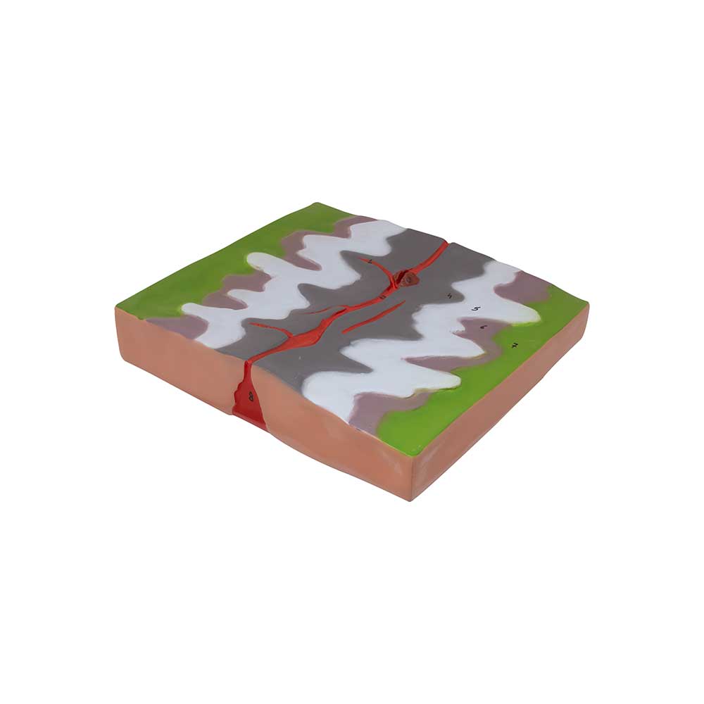 This model demonstrates lava plateau formation, highlighting lava layering from multiple eruptions, fissures as lava pathways, and the magma source. It features fissures, molten lava, cinder cones, and lava layers (new, older, oldest), alongside a plain and magma chamber, offering a detailed view of volcanic processes and geological stratigraphy typical of a lava plateau. Highly featured model with size of 40 x 35cm