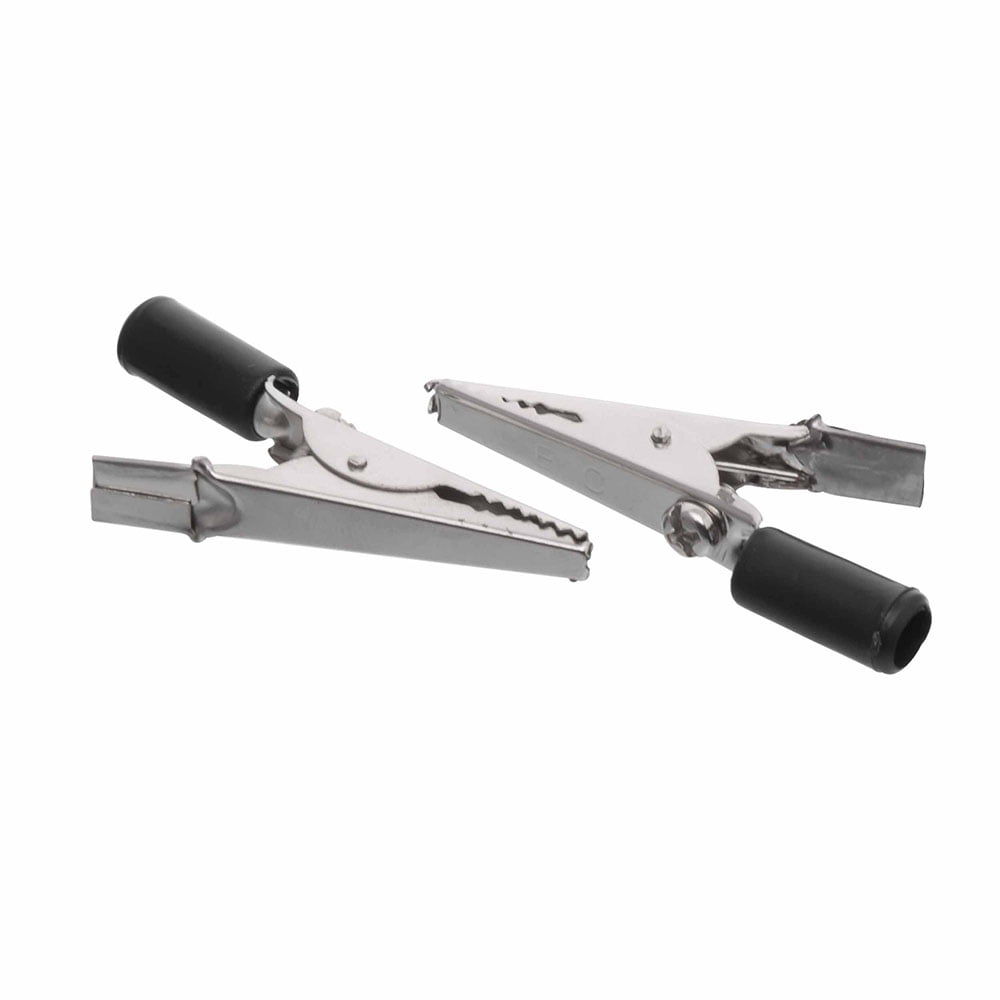 Nickel plated, It is one side insulated. Wire can be connected by screw, soldering and also accepts 4 mm plug. Colours Red and Black. Length 50.6 mm Jaws Open 11.3 mm.