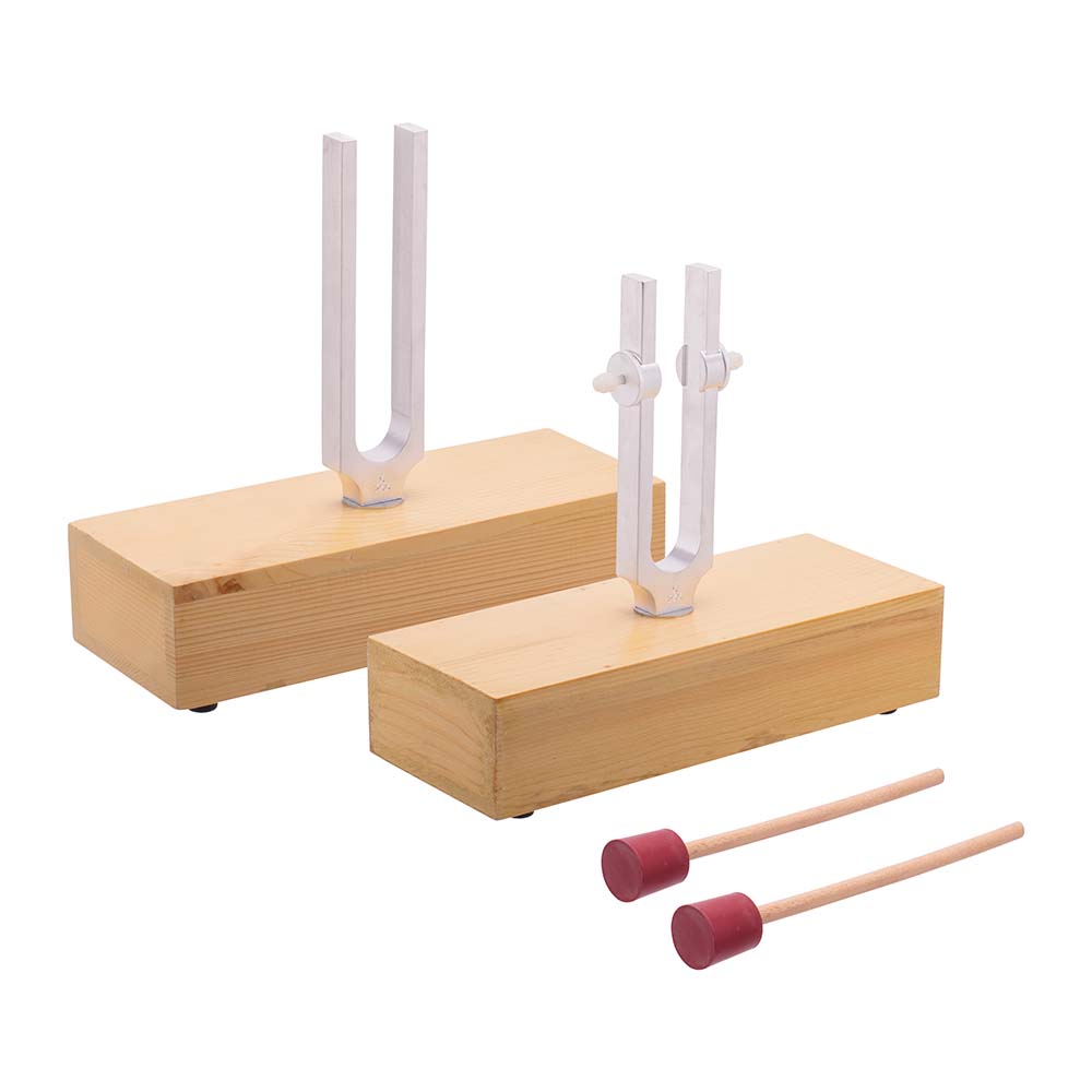 Set of two resonance boxes with extra heavy aluminium forks having double the duration of audible vibration than the ordinary forks. One fork is weighted and can be adjusted over range of about 30 Hz. forks are of different lengths 19.4 cm and 17.5 cm approx.
