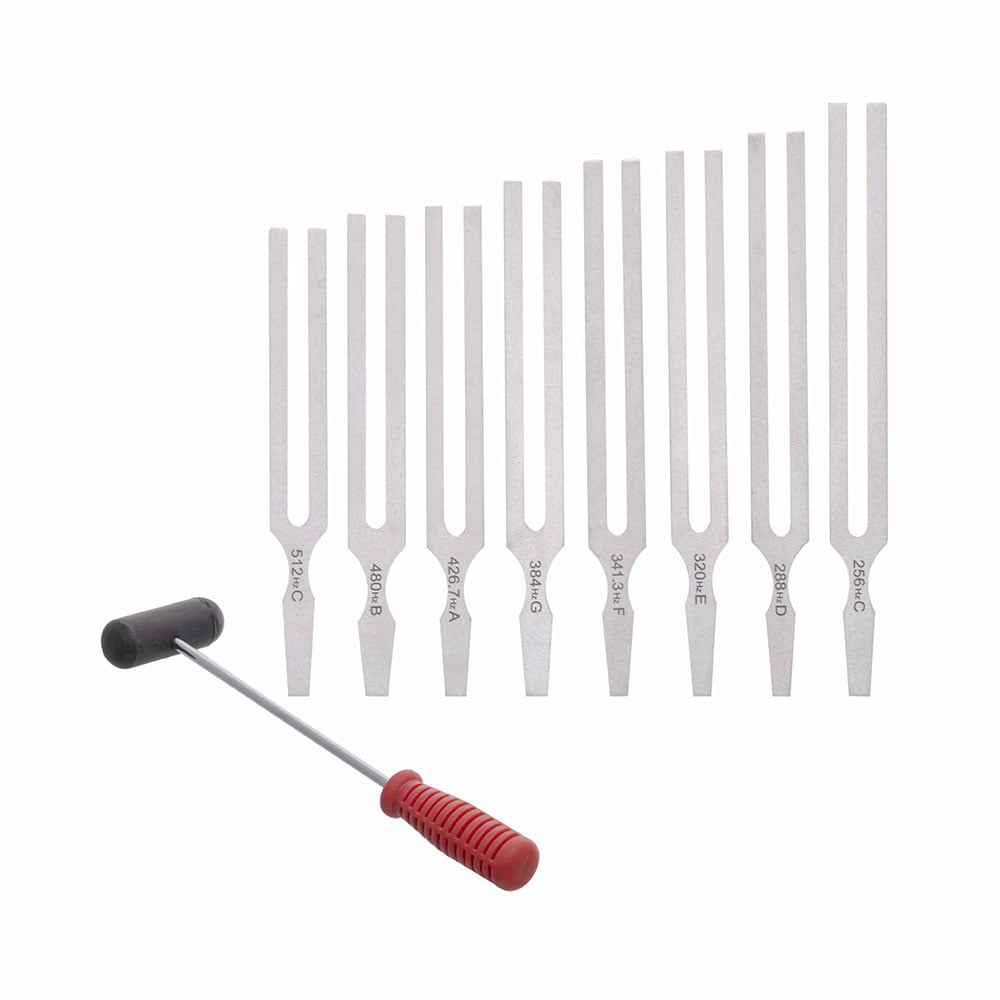| Description | SET OF 8: Aluminium, frequency 256 to 512 Hz, set of 8, in case with hammer., SET OF 13: Consists of 13 aluminum tuning forks (G-100, C-128, C-256, D-288, E-320, F-341.3, G-384, A-426.6, B-480, C-512, C-1024, C-2048 and C-4096) packaged in a wooden box. Includes a mallet. Forks are stamped with frequency and note |
