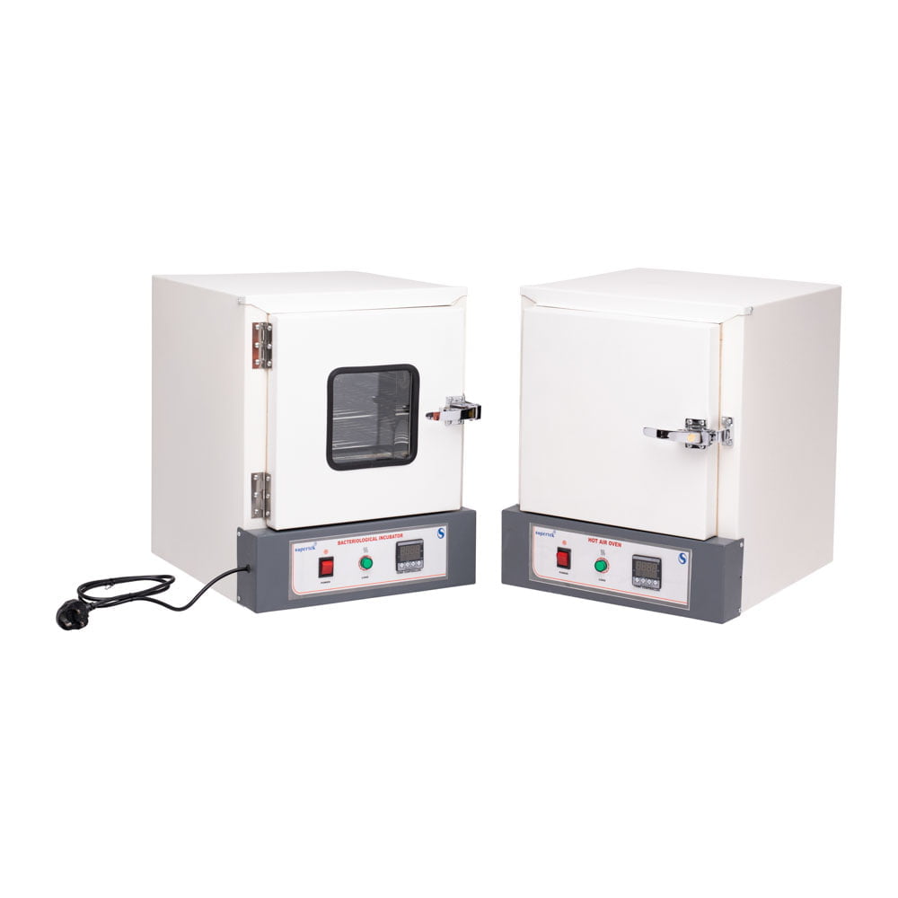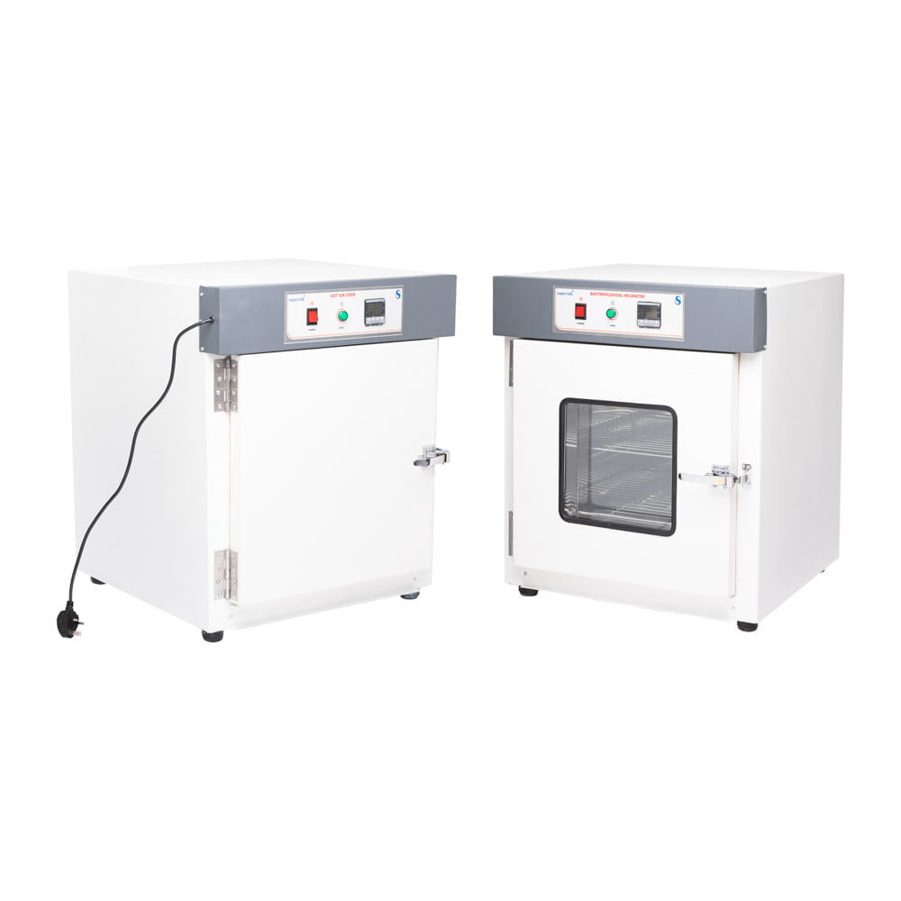 For heating up to 250°C. Inside chamber made of thick aluminium or stainless steel sheet. Outside made of mild steel, the gap between the walls being filled with glass wool. Heating elements are placed in ribs at the bottom and sides of chamber for uniform heating. Thermostatic control is provided which gives a temperature fluctuation of not more than ±1 °C read by an L-shape thermometer. The insulated door closes firmly against heat resistant gasket and is provided with a handle with spring latch. Front panel has ON / OFF switch, 2 neon indicators and dial for temperature setting. Unit provided with 1.5 m of 3-core cable. Works on 220-240 VAC.