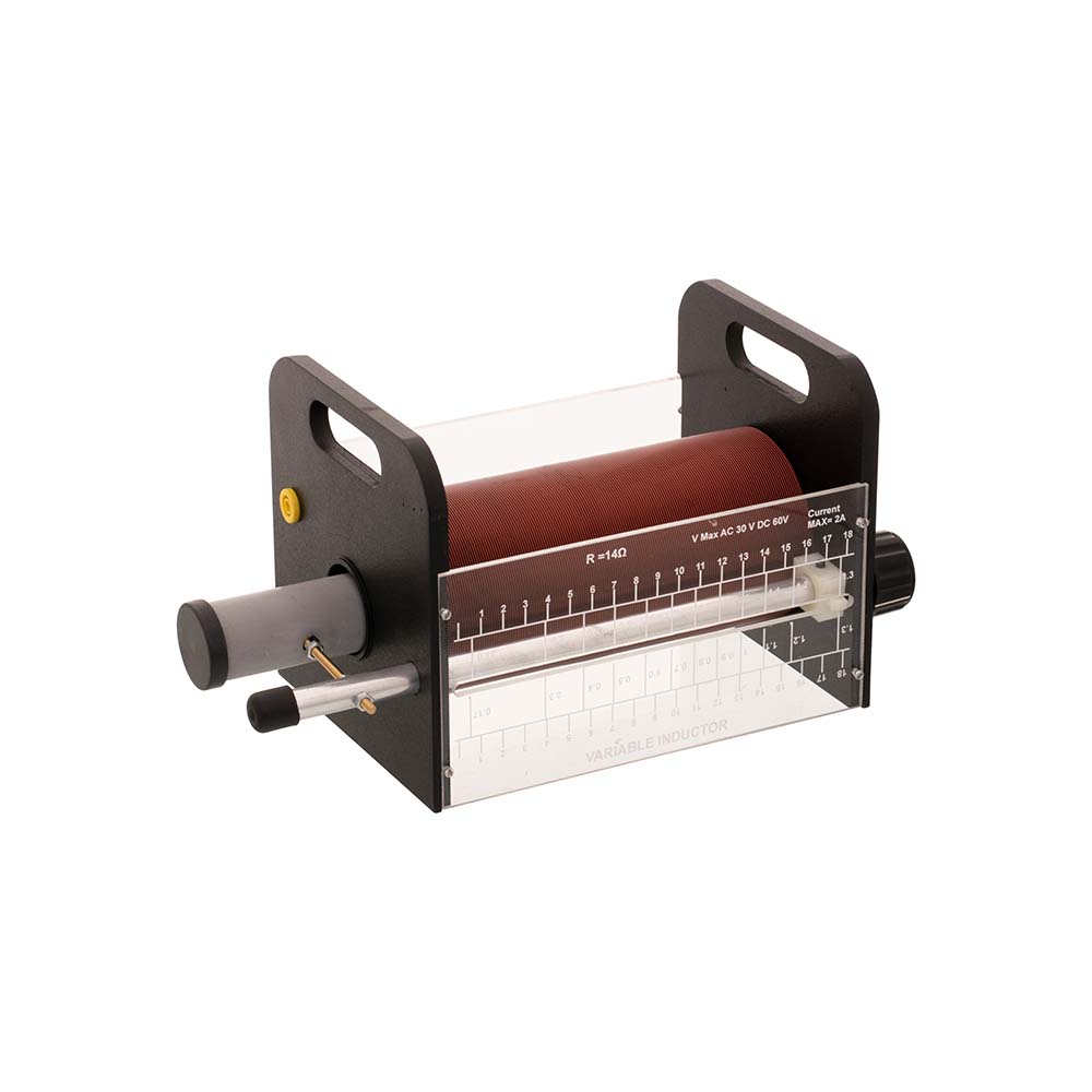 The enameled wire winding and a cylindrical soft iron core are built into this unit. The iron core displacement inside the winding can manually adjusted by the knob to give precise measurements up to 1.3 H. Connections are made through 4mm sockets.