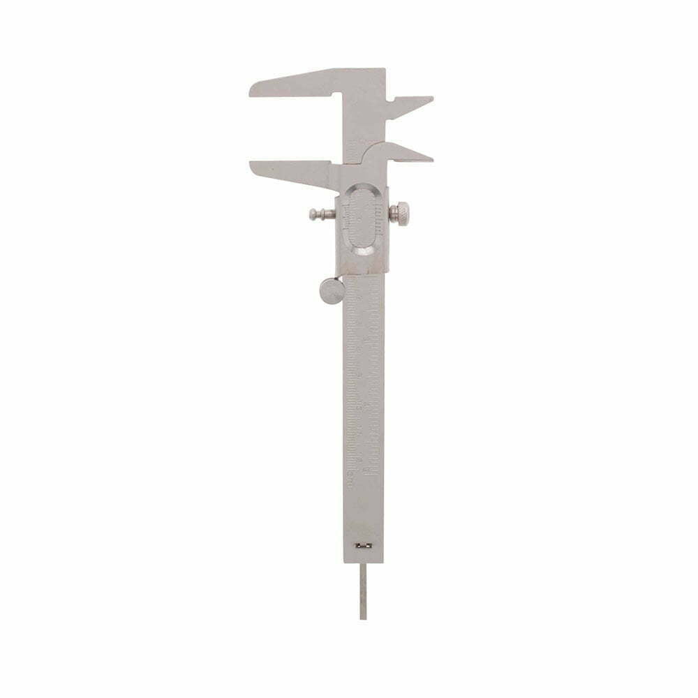 Plated steel. Double scale, reading 0-12 cm x 0.1 mm and 5 x 0.01 inch, with depth gauge & thumb wheel for fine adjustment, in plastic pouch.